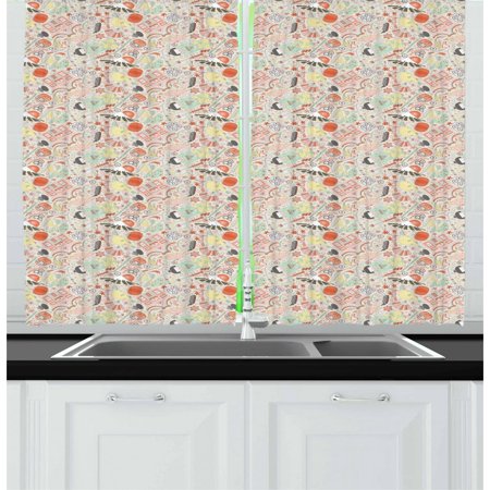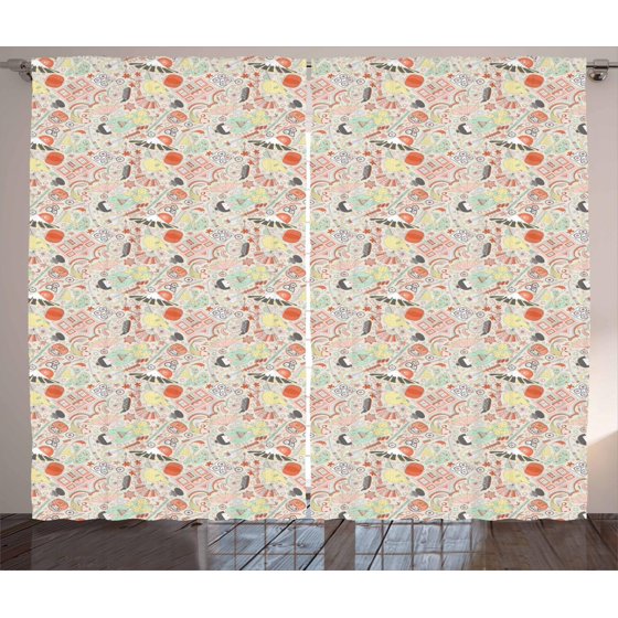 Japanese Curtains 2 Panels Set Doodle Koi Fish Sakura Bonsai Tree