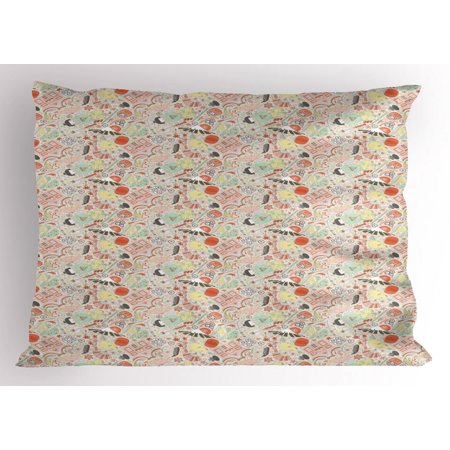 Japanese Pillow Sham Doodle Koi Fish Sakura Bonsai Tree And Geisha